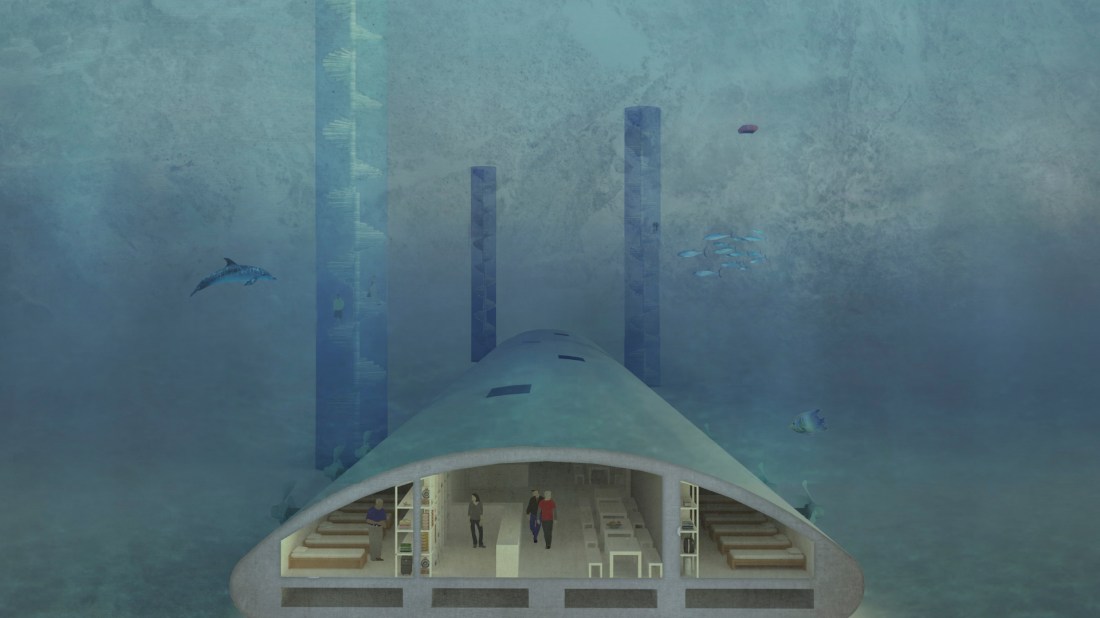 The object of this competition was to design a war bunker in 24 hours. The concept of my proposal was to use the waters against war. The sea can provide safety in its depth and a great natural camouflage, especially from aerial strikes. The people can get to the bunker with their families by boat and by entering the transparent cylindrical entrance towers, which also function as a ventilation system. The prototype can be applied in the mediterranean sea, as a stopping point for rest for refugees but it can also be applied in cities.