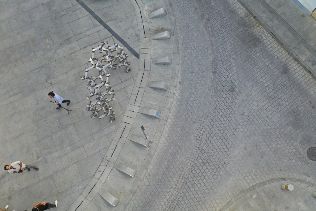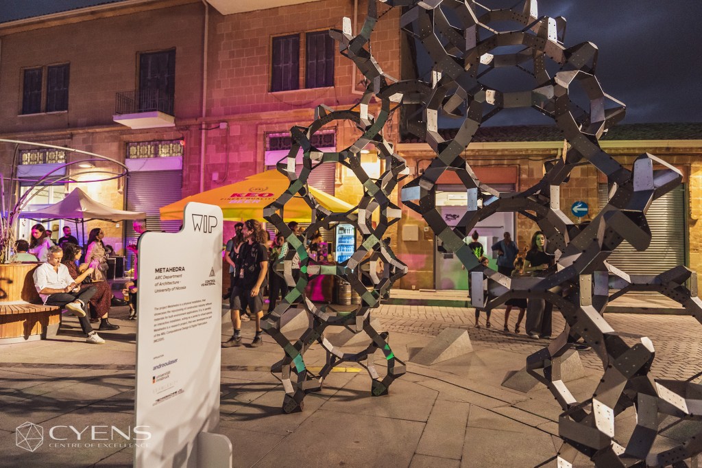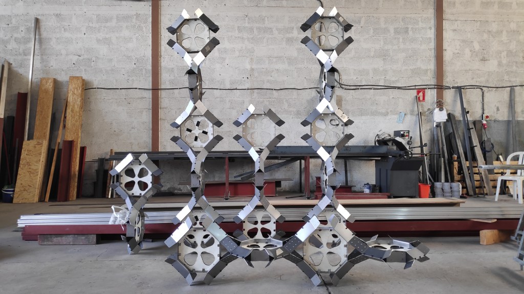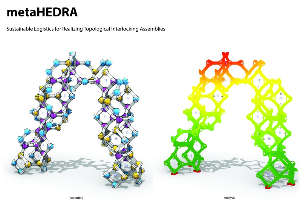 metaHEDRA explores the repurposing of construction industry leftover materials for built environment applications. For the development of metaHEDRA an aggregation process was utilised, to generate the initial geometry. Next, a grouping algorithm was assembled using K-Means principles, that was able to assemble closed groups of elements forming octagonal shapes. Structural analysis of the completed shape was performed in Karamba3D and in Robot Structural Analysis using interop links and C#. Analysis revealed critical deflections and stability and defined the required material thickness for individual pieces. An iterative process enabled the improvement of the aggregation shape to optimise the structures’ capacity. Using a custom developed algorithm in Grasshopper3D and C#, the solid shapes were developed and unrolled flat, generating the sheer metal information required for CNC machines.