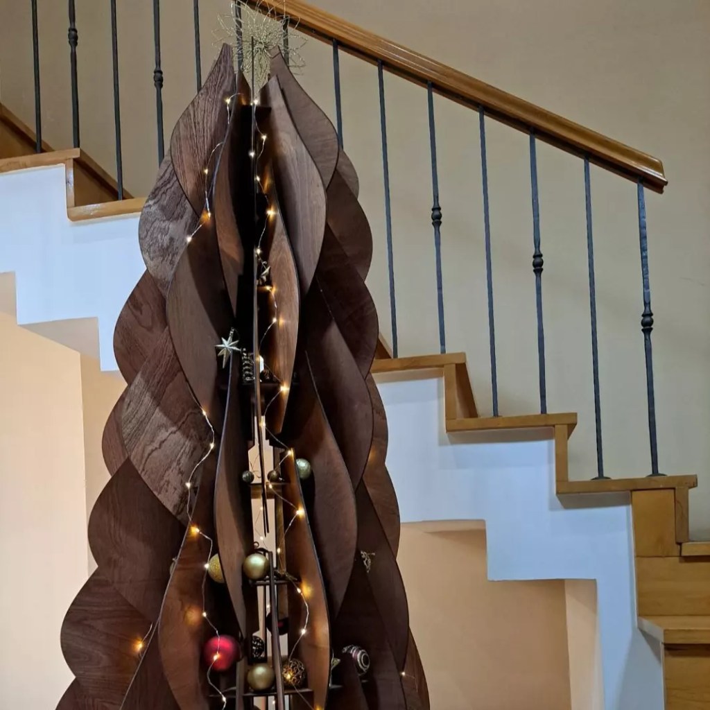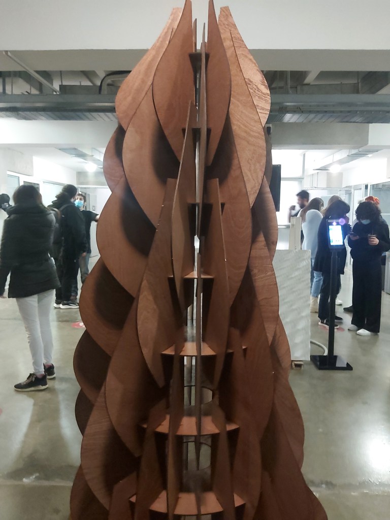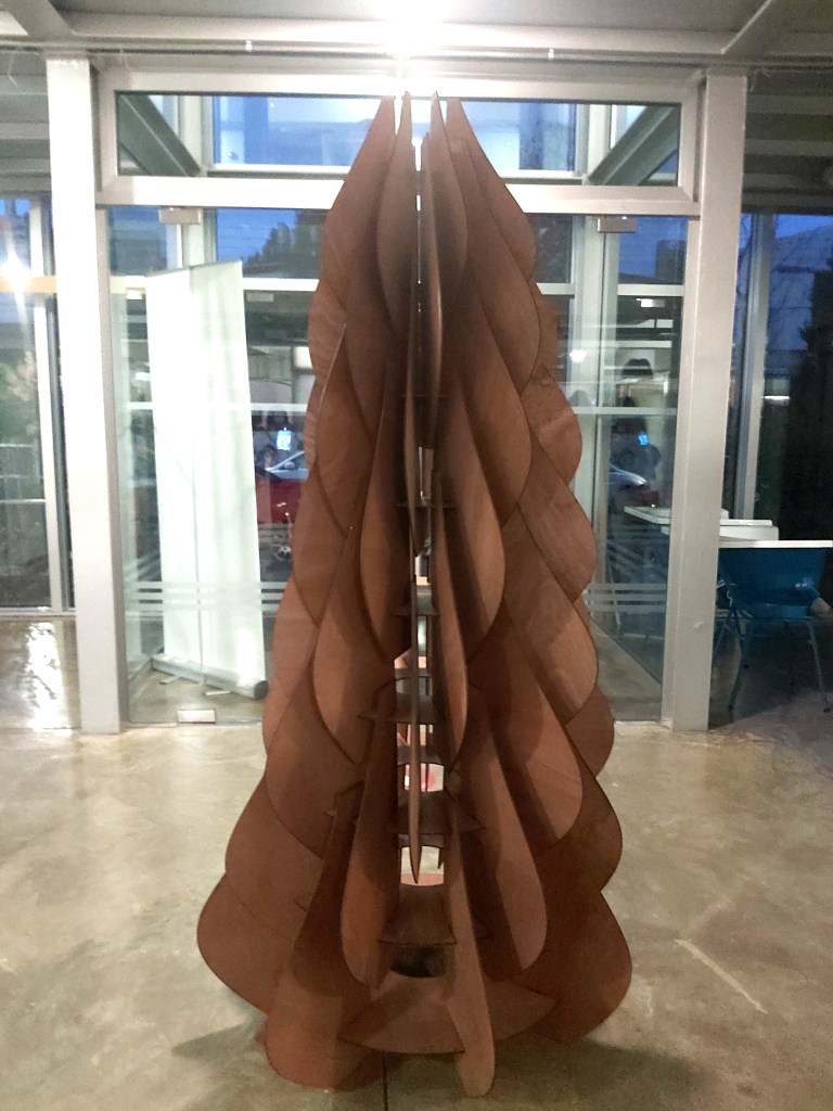 The tree was designed by the faculty and assembled by the students. The tree is a waffle structure consisting of circular vertical elements, connected to radial curved panels. The geometry was parametrically designed in Grasshopper, using sine curves for the rotation of the circles and attractor spirals for the curvature of the panels.